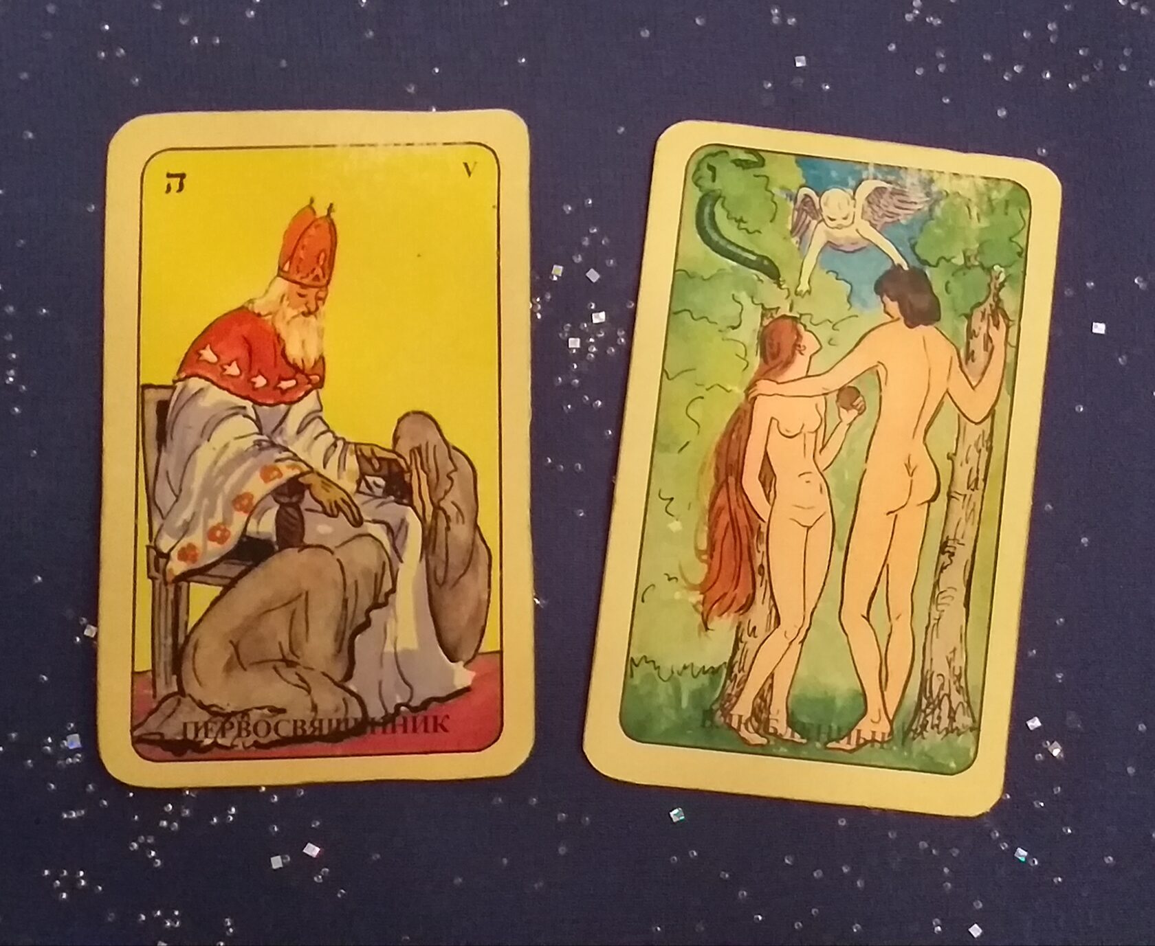 В колоде Het Monster (Евгений Николаевич Колесов) на карте Влюбленные, изображены обнаженные Адам и Ева в райском саду. Над ними парит Ангел. Он касается головы Адама и, словно, пытается уберечь его от фатальной ошибки. А из ветвей древа познания выглядывает сатана, в образе змея-искусителя, который нашептывает Еве соблазнительные речи. Запретный плод – уже в ее руке, но Ева задумчиво смотрит на Ангела.