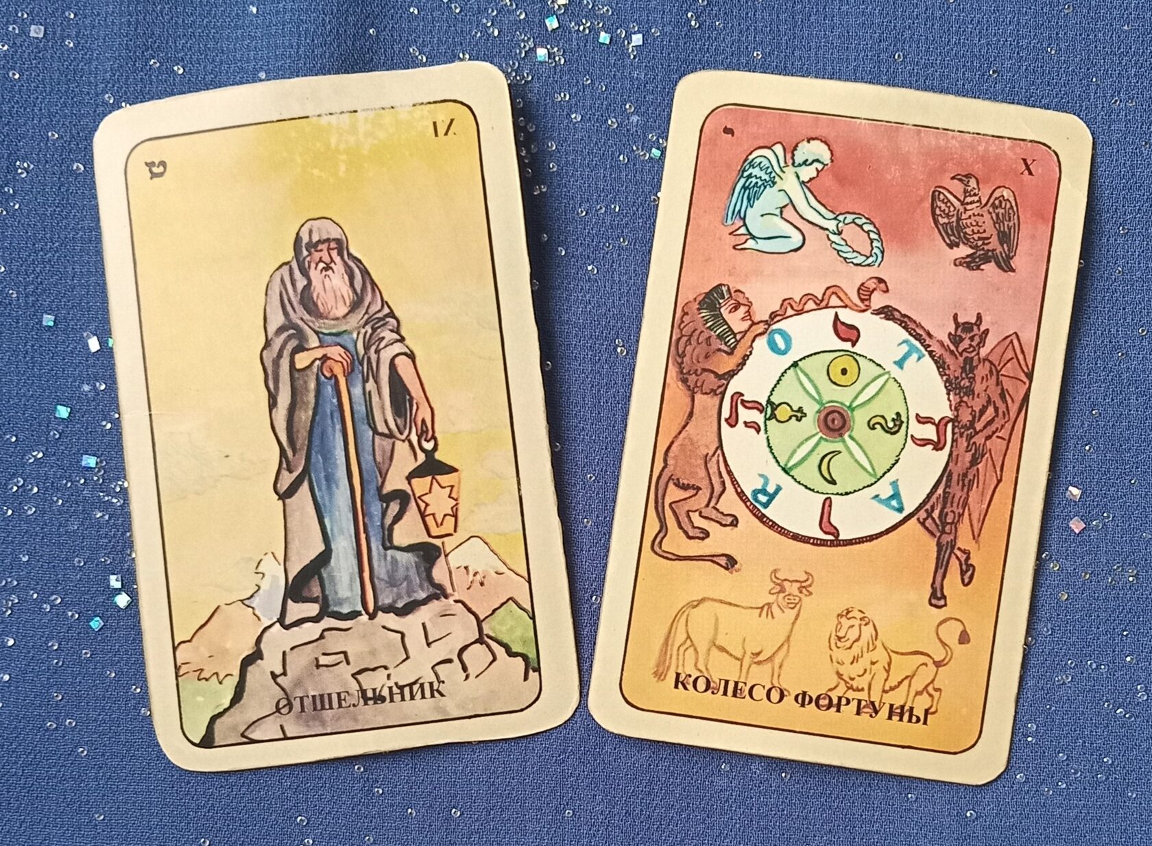 Отшельник – это старый, одинокий человек, вдали от мирской суеты, размышляющий над превратностями нашей жизни. Он стоит на вершине горы, и вокруг него – одни лишь горы. Правой рукой Отшельник опирается на золотой посох, олицетворяющий материю. Он обычный человек из плоти и крови.